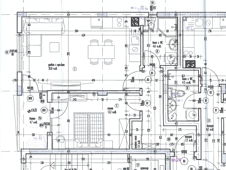 - Дневен тракт с кухненски кът, зона за хранене и почивка 25.00 кв.м
