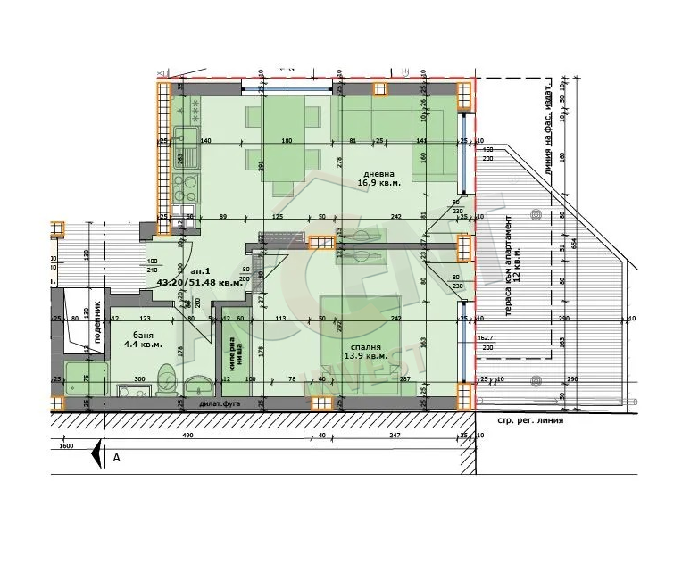 Апартаментът се състои от: Антре, Дневна с кухня, Спалня, Баня с Тоалет и 12 кв.м. тераса.