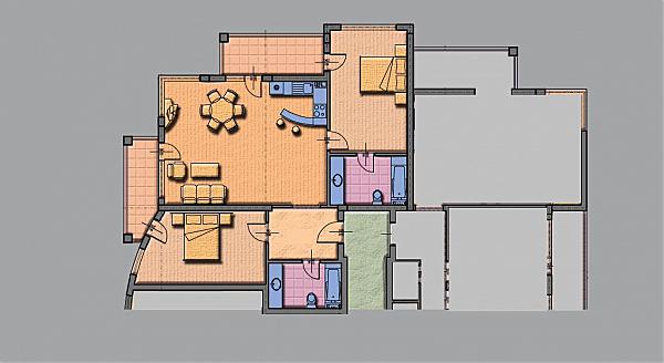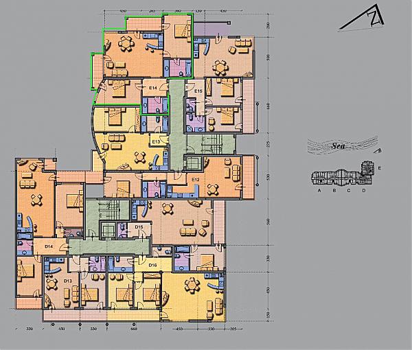 Жилището е разположено на 4-ти етаж в комплекса, заема площ 128,94 кв.м. (жилищна площ 118,27 кв.м.). Много светъл и слънчев апартамент. Всички стаи имат гледка към морето! Апартаментът се състои от: входно антре, просторен дневен тракт с трапезария и кухня, две спални, две санитарни помещения, две тераси. Продава се напълно обзаведен.