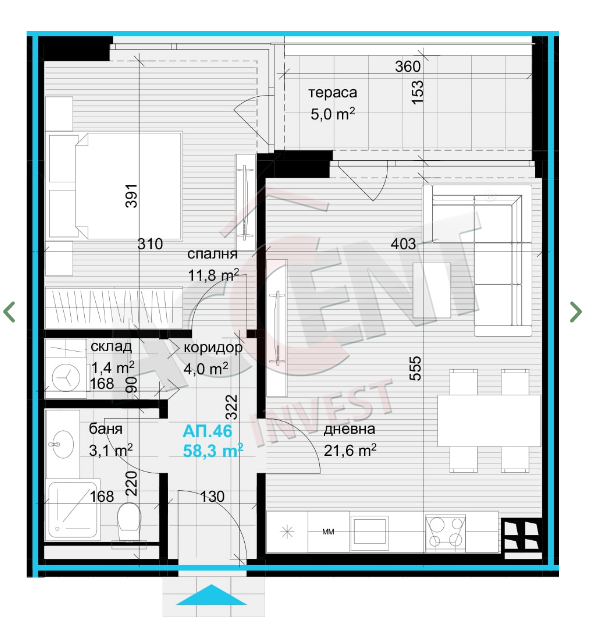 Имота е със следното разпределение: входно антре, дневна с кухненска част, спалня, баня с тоалет, склад и тераса.