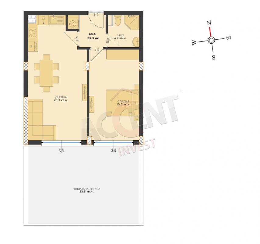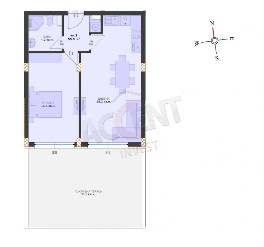 Апартаментът се намира на втори етаж и е с южно изложение. Застроената му площ е 55,44 кв.м. Към жилището има и голяма тераса с площ 33,41 кв.м., а също така ид.ч. от общите и Избено помещение с големина 2,17 кв.м. Обща площ 99,36 кв.м. Разпределение: входно антре, баня с тоалет, перално помещение/килер, дневна с кухня, спалня и тераса. Степен на завършеност – БДС. Срок на завършване – 2026 г.