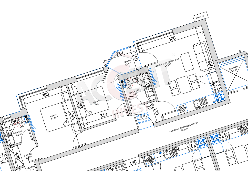 Акцент Инвест ви предлага Тристаен Апартамент с изложение СЗ/СИ и площ от 79,33 кв.м. находящ се на първи етаж в сграда на четири етажа.