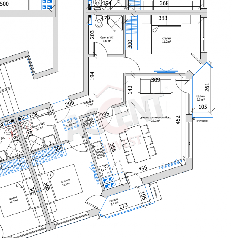 Акцент Инвест ви предлага Тристаен Апартамент с изложение Изток-Югоизток и площ от 85,08 кв.м. находящ се на партерен етаж в сграда на четири етажа.
