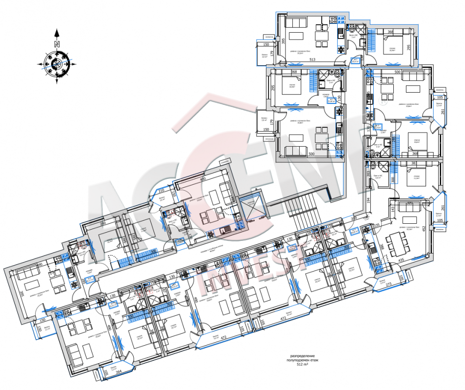 Апартаментът се състои от: антре, дневна с кухненски бокс, две спални, две бани с тоалет и два балкона.