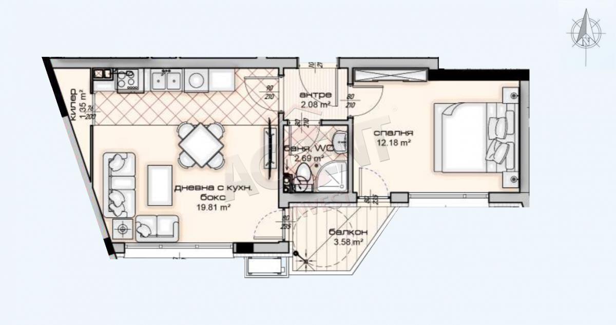 Accent Invest offers you a One-Bedroom Apartment with an area of 59.67 sq.m. located in a neat small building on five floors, which houses 16 apartments, as well as open and underground parking spaces and garages.
