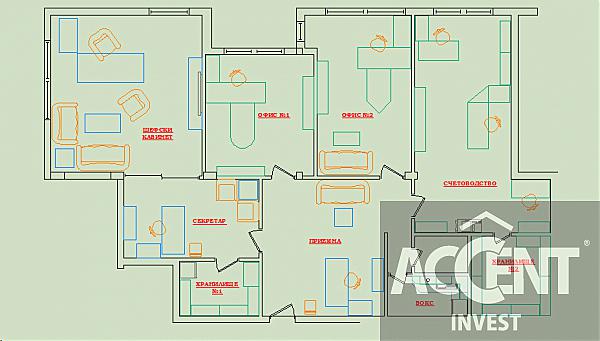 Accent Invest is pleased to offer luxury office space for sale, located on 6th floor in new building located near the Sports Hall. The office has a total area of 195 square meters, consisting of seven separate rooms and bathroom bitovka. Workplaces are divided as follows: reception - 29 square meters, large room - 34 sq.m., secretary office to office - 15 square meters, office secretary archive - 6 square meters, office № 1-19 square meters, office № 2 - 22 square meters, office № 3 - 33 square meters, and archive office № 3 - 9 m2 The office is luxuriously finished with solid wood paneling, quality paints in bright colors, colorful stained glass imported from Moscow, fully furnished with luxurious solid wood furniture, leather sofas and more. The office is very bright and spacious with large windows, providing a nice view. The building has luxurious common parts, elevator and private parking. At the office there are two parking lots.