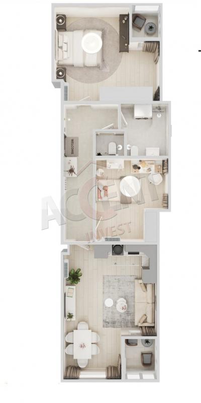 Accent Invest offers to your attention a sunny two-bedroom apartment, completed turnkey, in the area of Sports Hall and Flowers of Chataldzha. The apartment comes with a bright living room with kitchenette, two bedrooms, bathroom with toilet, separate second toilet, as well as two balconies with southern and eastern exposure.