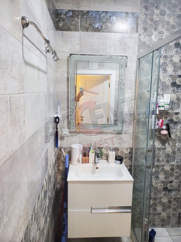 The apartment is positioned on the eighth-last floor and has an area of 90 sq m, which functionally includes a living room with kitchen, two bedrooms, a corridor, a combined bathroom, and a loggia-type terrace. The apartment faces east-west, which makes it extremely sunny and warm throughout the day.