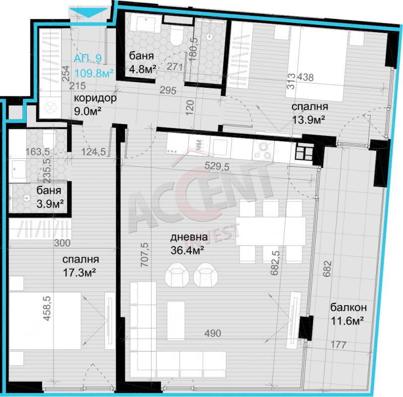 Property type: Apartment -> Three rooms